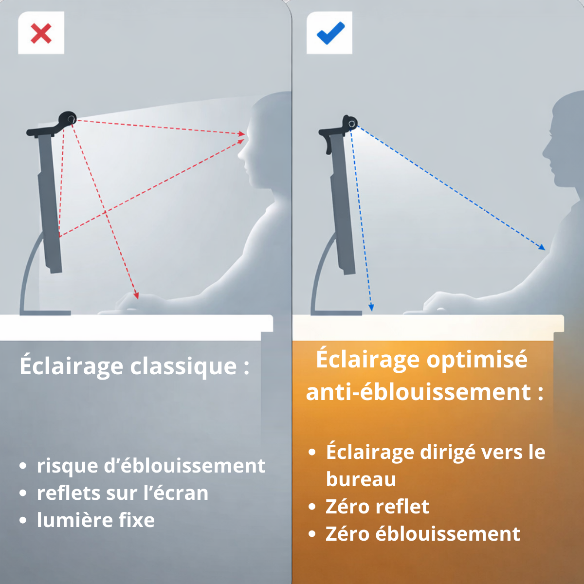 | Éclaire le bureau (pas l’écran) → moins de reflets | ✓ | ✕ |